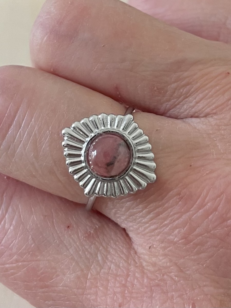 Ce cabochon rond est en Rhodochrosite, une jolie pierre gemme dont la couleur varie du rose pâle au rose franc en passant par le marron clair ou le noir, avec des bandes blanches.