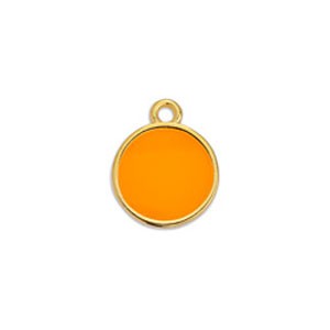 Cette mini-breloque ronde, en zamac dorée à l'or fin 24K, est recouverte de résine époxy orange fluo, effet vitrail (transparent).