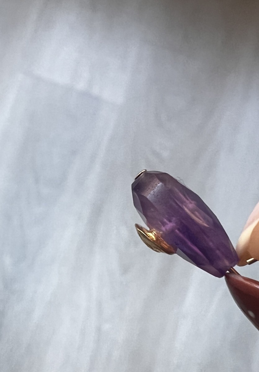 Avec ses dimensions de 14x10 mm, elle allie finesse et intensité. Son violet profond, naturellement lumineux, contraste avec l’éclat du doré pour un rendu à la fois chic et sophistiqué. Sa forme facettée en goutte permet de capter la lumière et de mettre en valeur la pierre dans toutes vos créations.