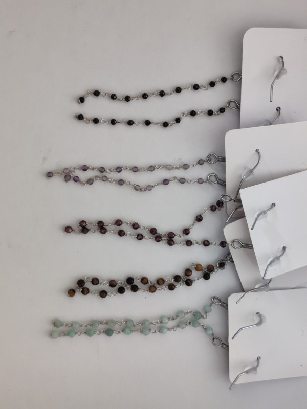 (de haut en bas : spinelle facettée, améthyste, grenat facetté, oeil de tigre, amazonite facettée)
