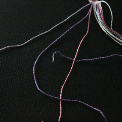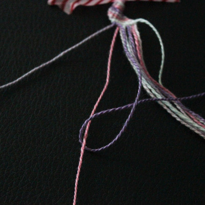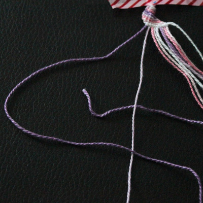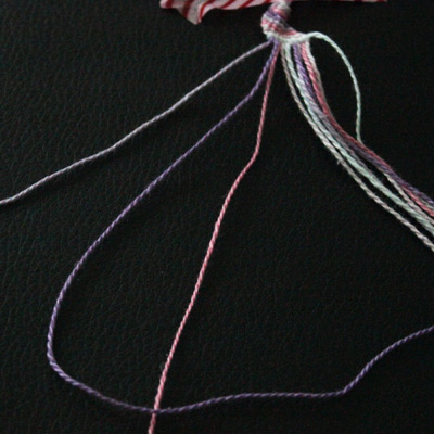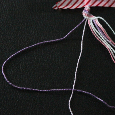 Du coup avec votre 1er fil, le violet foncé, faites des noeuds autour des autres fils, les uns après les autres. (2 fois autour du rose, puis 2 fois autour du rose clair, puis 2 fois autour du blanc etc..).