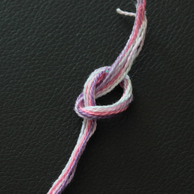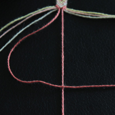Prenez le fil le plus à gauche, qu'on appelera 1er fil. Passez-le par dessus le suivant, ici le violet clair : cela forme un 4.