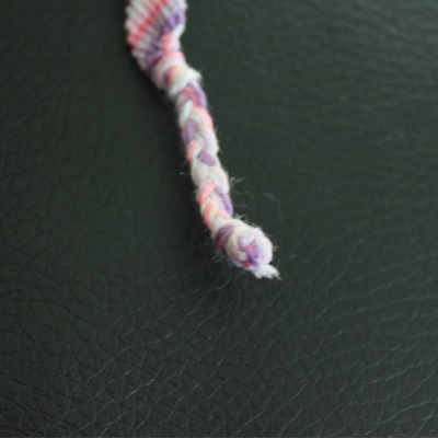 Prenez vos fils et commencez à faire une tresse. Faites un noeud pour terminer la tresse, et coupez les fils qui dépassent. Serrez bien le noeud, ajoutez y un point de colle.