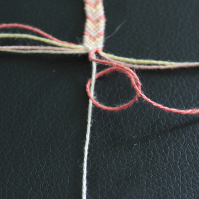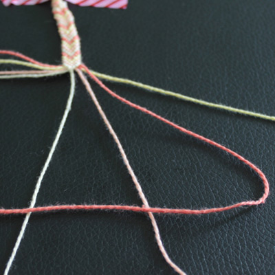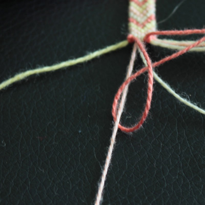 Du coup avec votre dernier fil toujours, faites des noeuds à l'envers autour des autres fils, les uns après les autres. (2 fois autour du rose clair, et 2 fois autour du jaune clair).