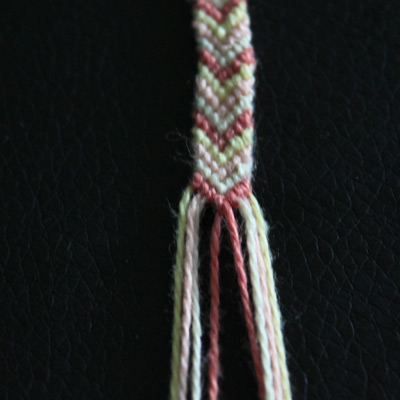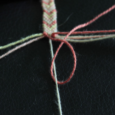 Maintenant vous vous retrouvez avec vos 2 fils de la même couleur, rouge, au centre. Nouez-les ensemble pour faire la pointe du chevron, avec deux noeud à l'endroit.