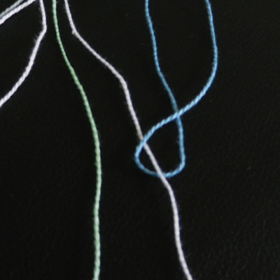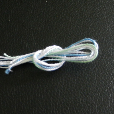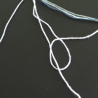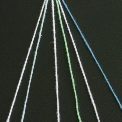 Votre fil principal doit être présent au même nombre que tous votre autres fils réunis. Ici j'ai choisi d'ajouter 3 fils de couleurs (bleu clair, vert et bleu), il me faut donc 3 fils blancs.