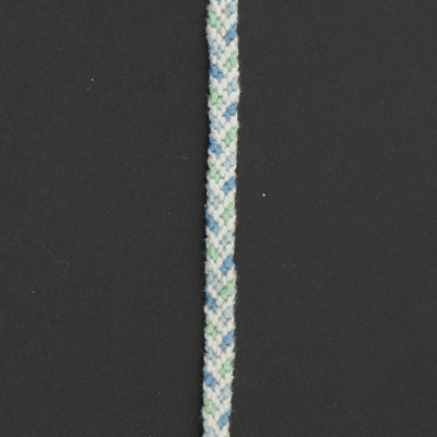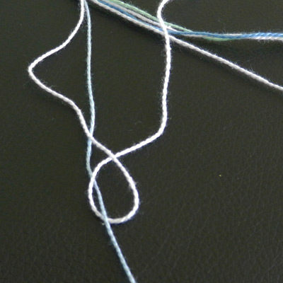Puis disposez vos fils dans l'ordre que vous souhaitez mais en alternant toujours un fil de couleur avec un fil de la couleur principale (ici blanc, bleu clair, blanc, vert, blanc, bleu).