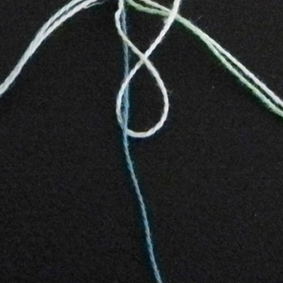 Toujours avec votre dernier fil bleu, faites de nouveau 2 noeuds à l'envers autour du fil précédent, ici le vert.