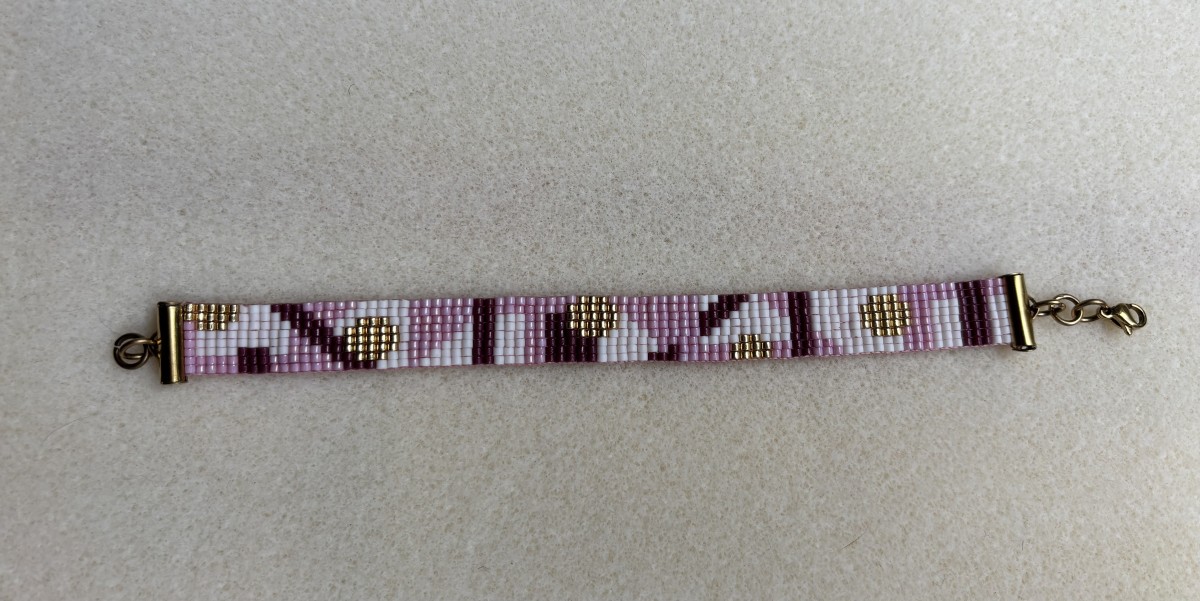 Apprêts : Pour des badges, vous pouvez coller vos tissages sur des broches et des pins. Pour des bracelets, vous pouvez soit finir votre bracelet en pointe de chaque côté et fixer un anneau fermé à chaque pointe, puis vous ajouterez le fermoir, ou bien, vous pouvez utiliser les embouts ou fermoirs à glisser en utilisant cette technique : Comment adapter le tissage Peyote à un embout pour tissage ?