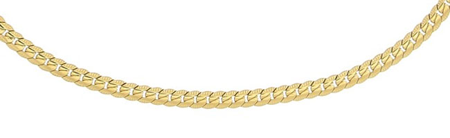 Une chaîne encore plus aérée que la gourmette. Elle est plate lorsqu’on la porte grâce aux maillons qui s’imbriquent entre eux grâce à une torsade à leur jonction.