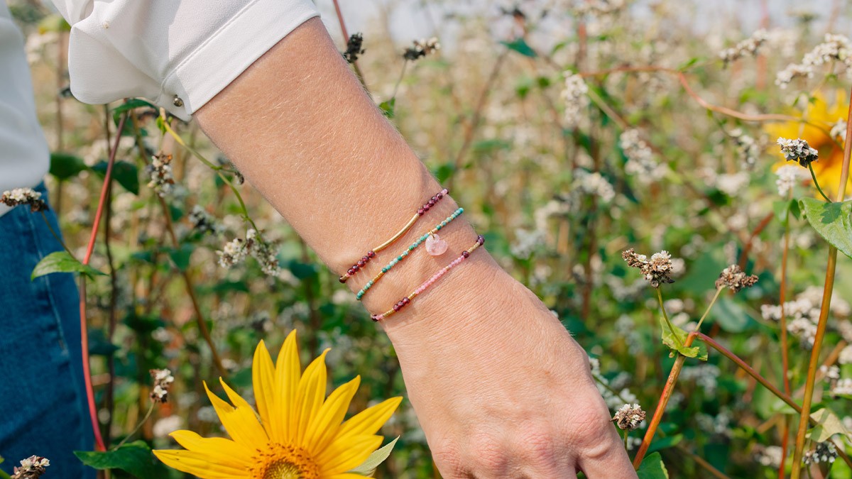 Les bijoux de la collection "L'Été Indien" sont composés de colliers délicats, de bracelets fins et de créoles agrémentées de breloques et de perles en pierres naturelles. Les pierres utilisées varient dans des tons verts, roses, grenat et turquoise, rappelant les couleurs de la nature.