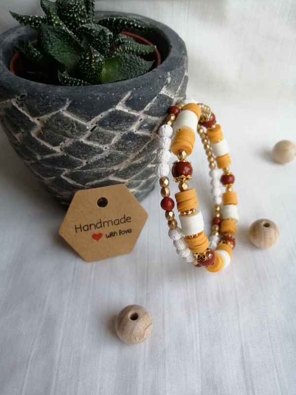 Ce modèle est composé de hesihi 6 mm crème et caramel, de 30 perles pierre de lave blanche 4 mm, de 9 perles Lapis Lazuli 6 mm, 19 facettes de bohème 3 mm, 18 coupelles fleurs 6 mm, 16 rondelles dorées 5 mm.