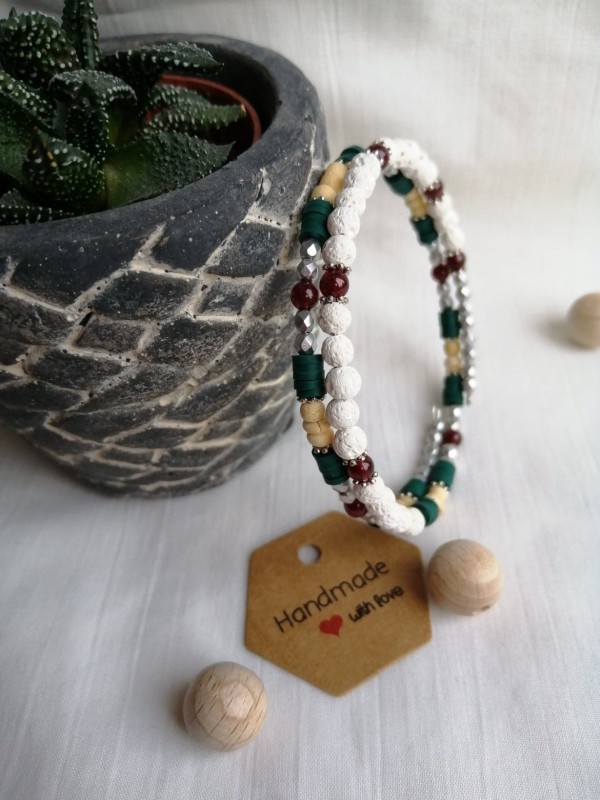 L'avantage de ce DIY bracelet multirang est qu'il n'y a pas besoin de fermoir. On utilise du fil mémoire. Il s'agit d'un fil métallique formé selon un certain diamètre de cercle en usine et qui reprend ça forme même si on l'étire. Vous pourrez donc enfiler les bracelets en les faisant tourner autour de votre poignet. Il existe plusieurs diamètres de fil mémoire, alors vérifiez votre tour de poignet et choisissez celui qui vous conviendra le mieux. Ici nous utilisons un bracelet fil mémoire de 60 mm de diamètre ce qui correspondra à une grande majorité de poignet de S à M. Si votre poignet fait plus de 15,5 cm vous devrez peut-être prendre du 65 ou du 70 mm.