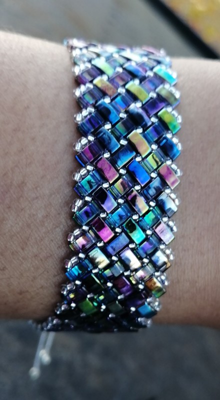 Commencez par tisser une bande toute droite d'environ 20 à 22 cm en suivant les indications techniques données dans le tutoriel Bracelet 3 chevrons en perles Miyuki Half Tila et rocailles