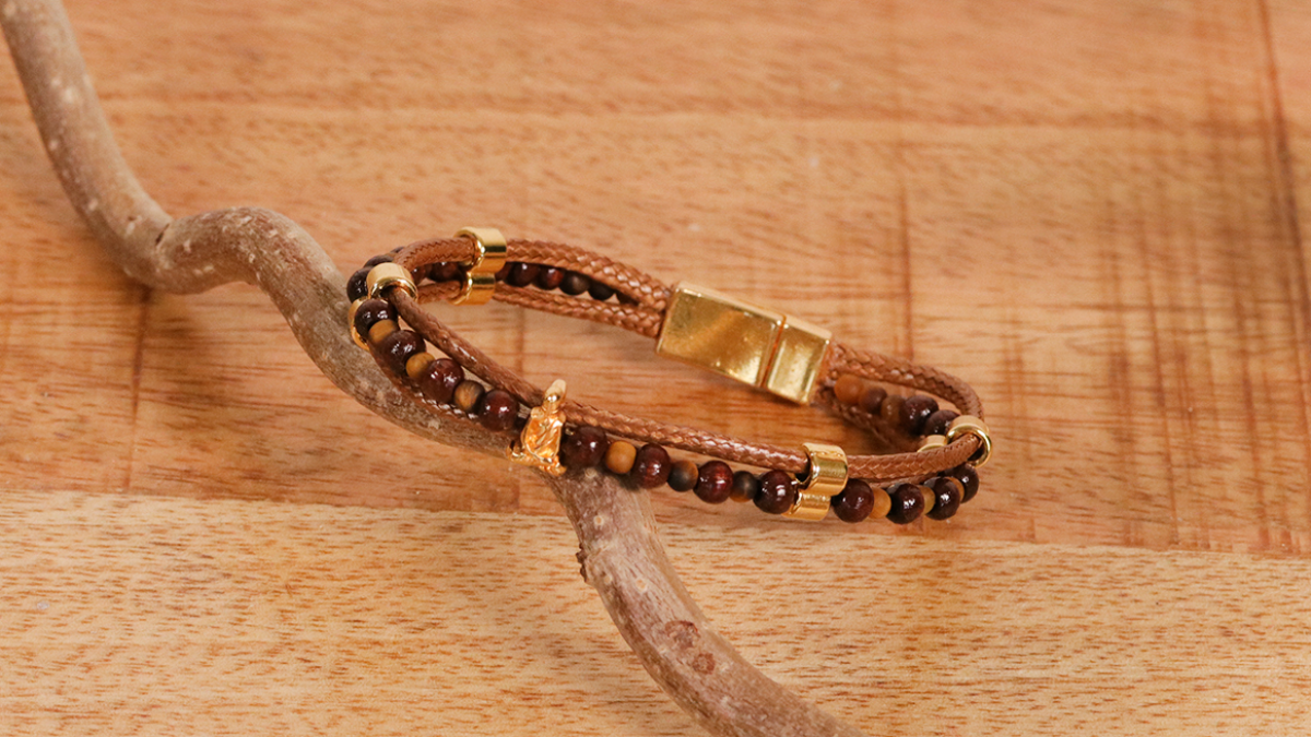 Découvrez sans plus attendre ce tutoriel bijou pour réaliser un bracelet homme multirang. Fin et dans les tons marron et doré, il conviendra aussi aux femmes et pourquoi pas faire des bracelets de couple assortis ? Ce bracelet dispose d'un fermoir aimanté résistant, de perles en bois et perles en pierre oeil de tigre dépoli.