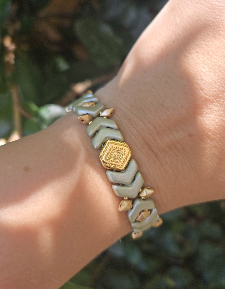 Alignez toutes les perles et les apprêts sur la table pour mesurer la longueur du bracelet. Ajustez le nombre de perles. Par exemple, sur la photo, la longueur du bracelet est d'environ 14 cm, ce qui est parfait pour un poignet entre 14,5 et 15 cm car il faut encore ajouter le fermoir et la chaînette d'extension.