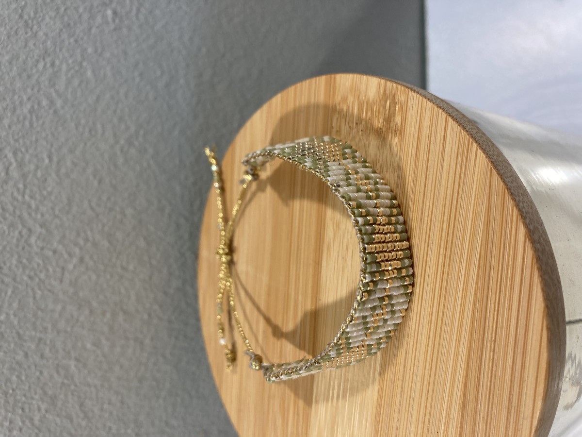 Coupez 2 morceaux 50 cm de fil doré et attachez-les sur les deux clous de part et d'autres du métier à tisser en faisant en sorte d'avoir la même longueur des deux côtés. Ne serrez pas le noeud car vous devrez les défaire à la fin et ne surtout pas les couper. Ce fil va servir de bordure au bracelet et c'est sur celui-ci que vous ferez le noeud coulissant plus tard.