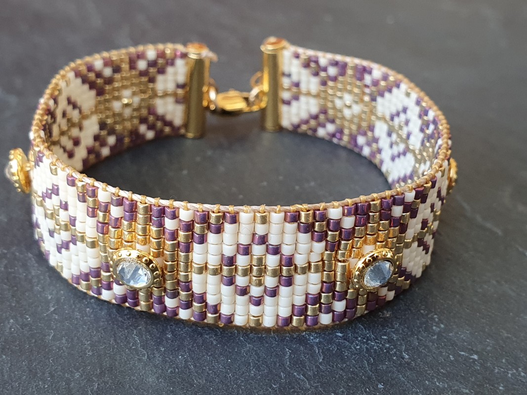 Défaites-le du métier à tisser à part le premier noeud, vous allez maintenant fixer les strass. Sur le premier fil du centre, enfilez les 3 ou 4 strass selon la longueur du bracelet souhaitée. Entoure le clou de l'autre côté pour fixer le deuxième fil. Passez à nouveau dans les strass et ainsi de suite. Vous devez passer 4 fils dans les strass. Faites attention à ne pas passer à côté d'un des strass.
