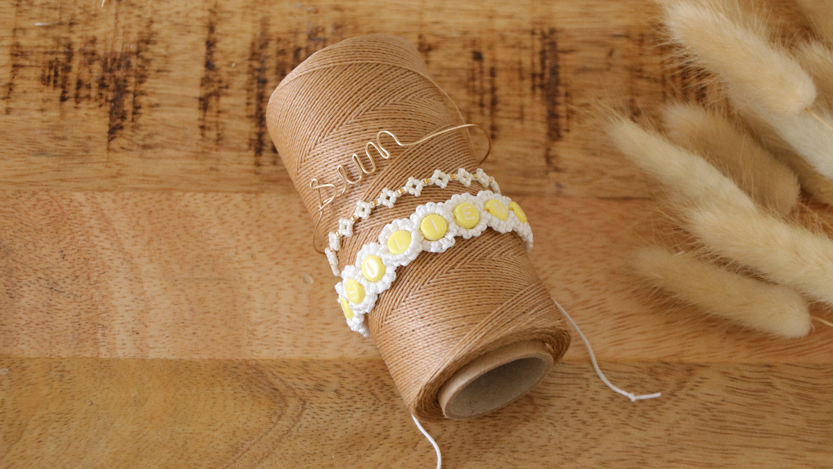 Aujourd'hui nous vous proposons de mixer trois tendances de l'été ! Les bracelets fleurs, le macramé et les perles lettres s'associent pour former un bracelet rétro inspiré des années 2000. Rien de compliqué pour ce tutoriel vidéo, il n'y a que deux noeuds macramé utilisés dans ce DIY : Le noeud plat macramé et le noeud de frivolité. Retrouvez les 11 noeuds de base en macramé dans notre fiche technique vidéo.
