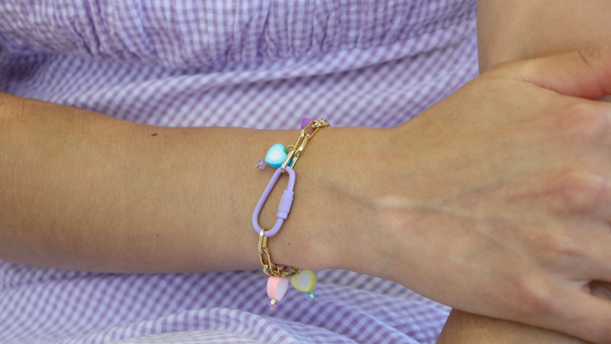 Pour le bracelet, ouvrez un maillon pour détacher 14 cm de chaîne. Préparez les breloques. Enfilez une toupie et une perle coeur pastel sur un clou tête plate. Pliez-le à 90 degrés à la base de la perle puis formez une boucle avec une pince ronde dans l'autre sens.