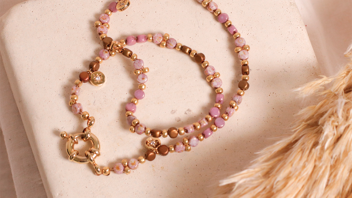 Côté couleur, on vous propose ici un doux mariage entre des perles aux nuances rosées et des perles dorées. Bien entendu, libre à vous de modifier les couleurs en choisissant parmi toutes les références de perles en verre Kalos par Puca, et toutes les références de rocailles Miyuki 8/0 disponibles sur notre site.