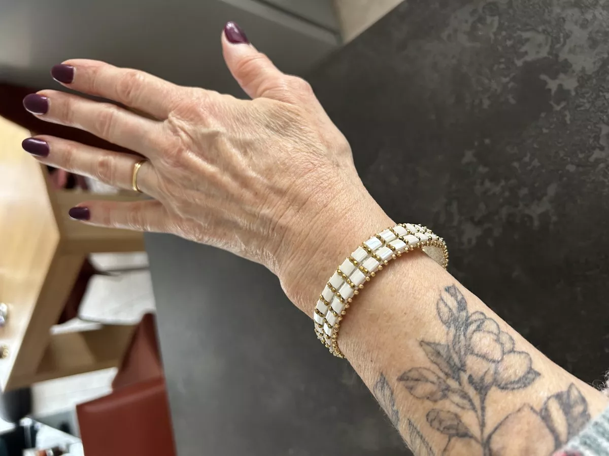 - Enfilez une perle, repassez à travers les deux perles qui se présentent sur le tissage.