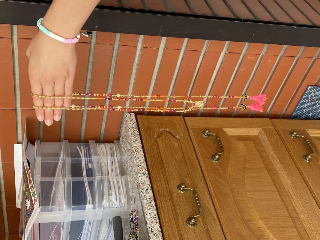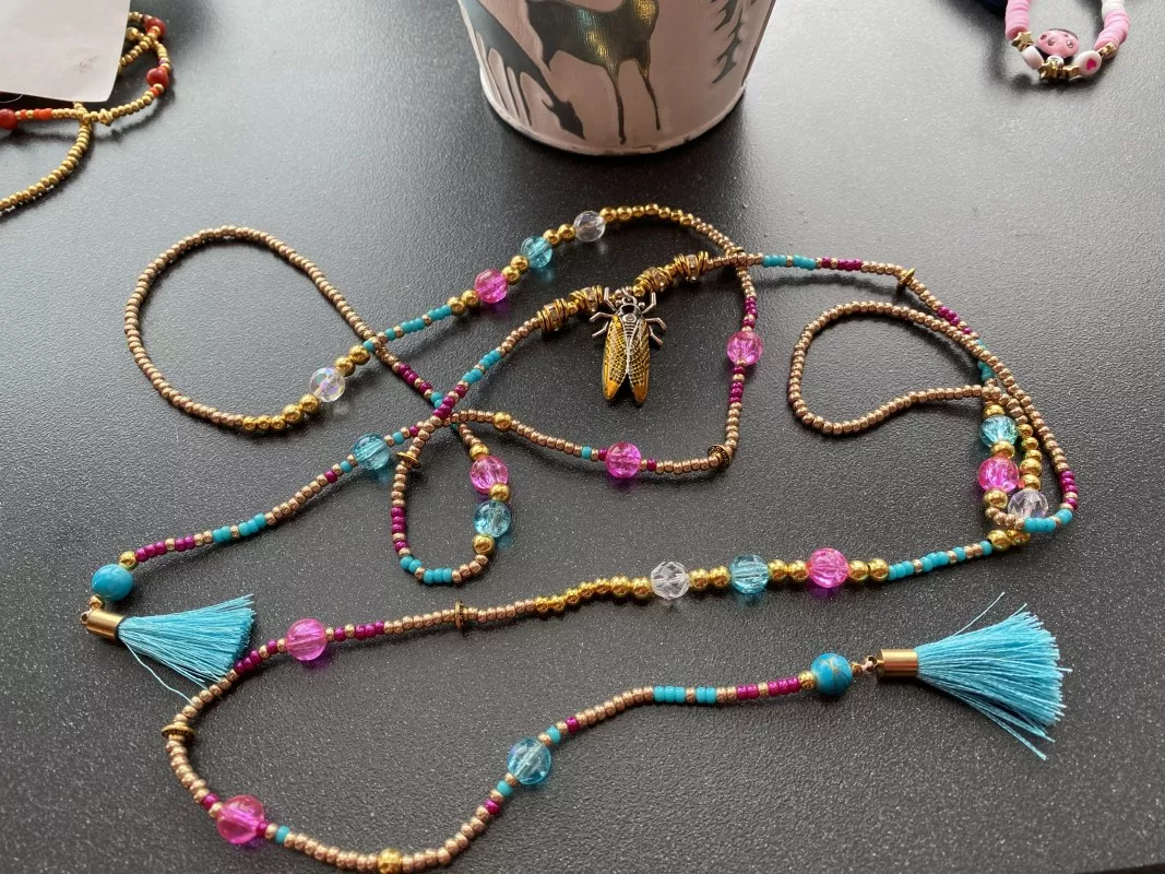 Ce collier mesure 135cm. Vous avez donc besoin d'utiliser votre fil de soie dans sa quasi-totalité selon la longueur choisie. Déroulez-le intégralement de son carton. Ce fil est très pratique car très résistant et son aiguille intégrée permet d'enfiler facilement toutes sortes de perles.