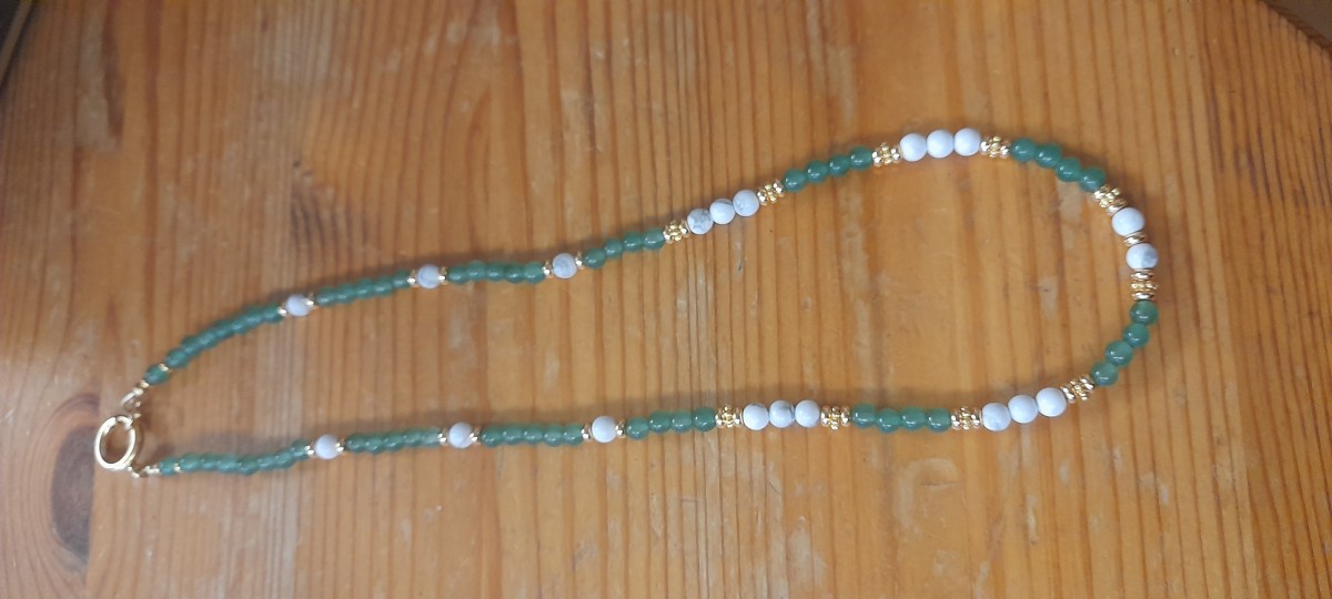 Enfilez 10 perles Howlite (plus si vous voulez faire un collier plus grand et que vous avez acheté un sachet de perles en plus). Enfilez ensuite 1 rondelle fleur dorée, 1 perle en Malachite 4 mm, 1 rondelle fleur, 5 Howlite, 1 rondelle fleur, 1 perle en Malachite 4 mm, 1 rondelle fleur.