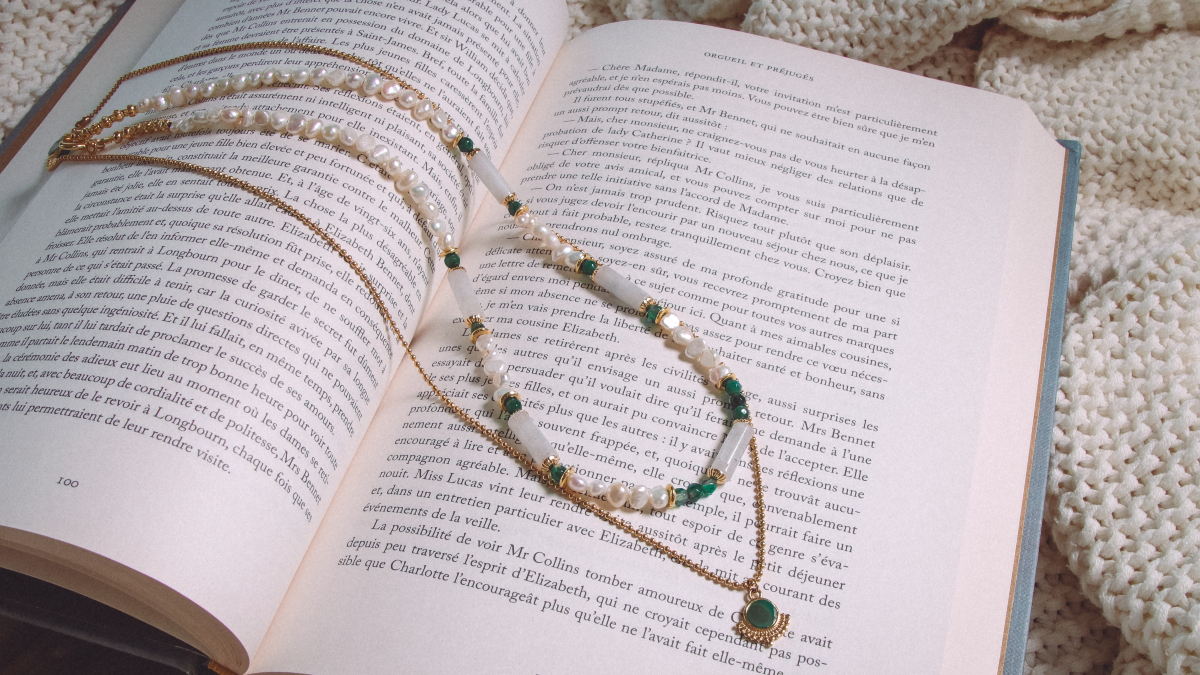 Ces perles en pierre naturelles sont mixées avec des perles d'eau douce qui accentuent le style apaisant du collier. Toutes ces perles aux jolis reflets iront parfaitement avec un pull ou gilet aux couleurs neutres comme du crème ou du camel. Elles seront très bien mettre en valeur un vêtement vert, qui est notre couleur coup de coeur de cet automne.