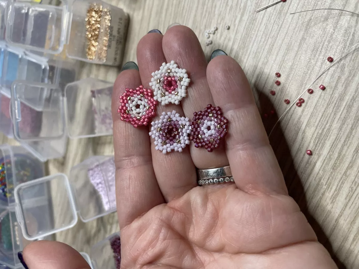 Pour fabriquer cette broche fleur, nous avons utilisé la technique du tissage en peyote circulaire. C'est une technique de tissage de perles à l'aiguille, qui ne nécessite pas de métier à tisser.