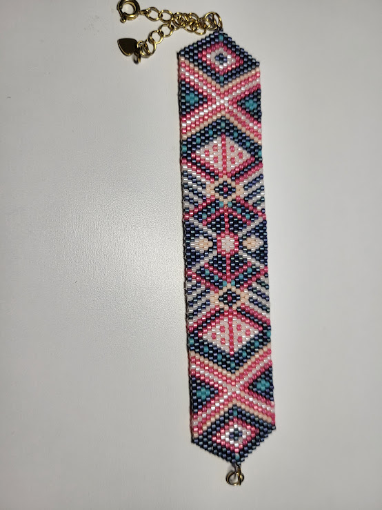 Cette méthode de tissage de perles permet de réaliser un bracelet tissé qui se termine en pointe. Nous n'avons pas tissé le bracelet avec des embouts de tissage pour le terminer. Pour accrocher le fermoir et la chaînette d'extension, nous avons simplement accrocher des anneaux fermés de chaque côté.
