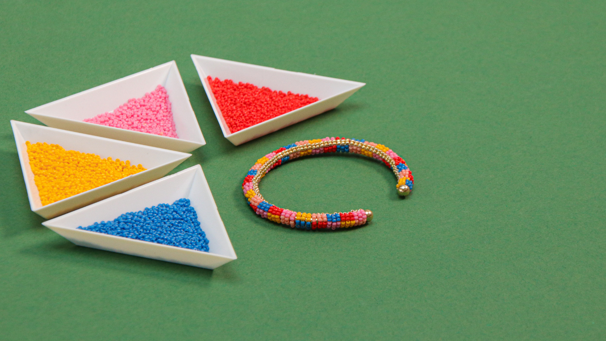 Finir le manchon après avoir réalisé la dernière boucle : par sécurité, faites remonter le fil dans la bande des perles dorées sur quelques rangs. Arrêtez ensuite le fil en faisant un nœud de chirurgien et en passant la queue du fil dans les perles avoisinantes avant de le couper. Bien évidemment, les deux extrémités du manchon doivent rester ouvertes pour pouvoir y faire glisser le bracelet-jonc.