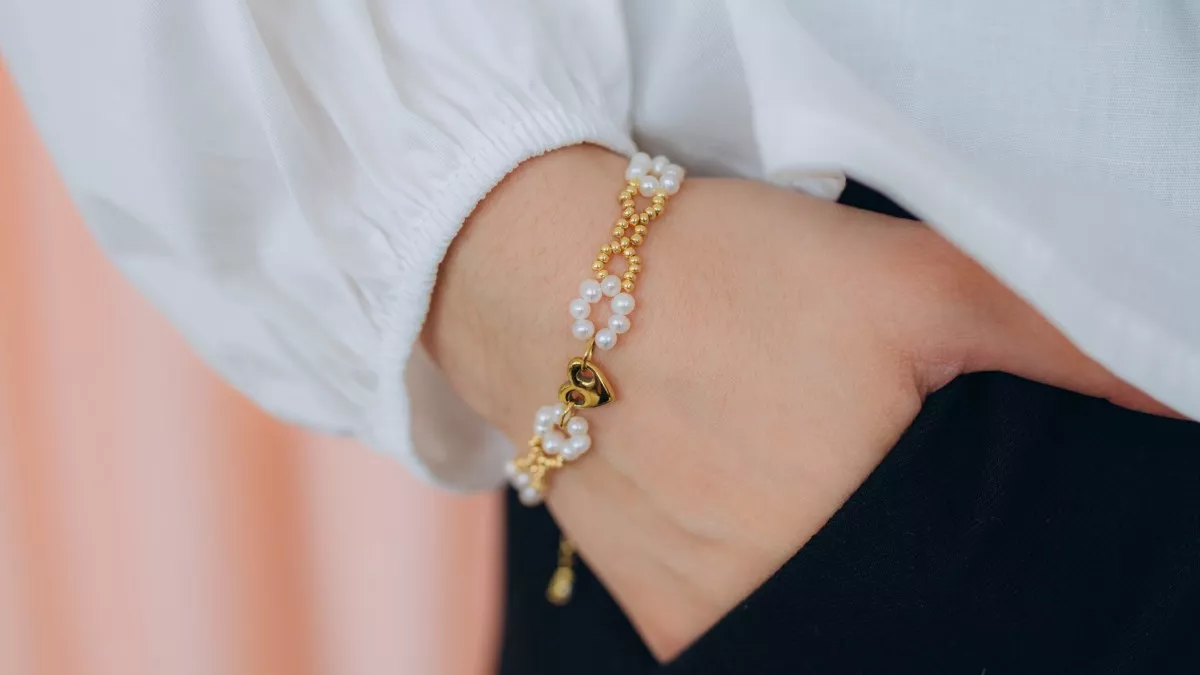 Pour un bracelet adapté à un poignet de 15 cm, enfilez cinq perles de rocailles sur chaque fil, puis une perle d'eau douce dans laquelle vous allez croiser les fils. Si vous devez rallonger le bracelet, répétez les étapes 3 et 4 et finissez sur une seule perle d'eau douce au lien de l'anneau entier de perles d'eau douce.