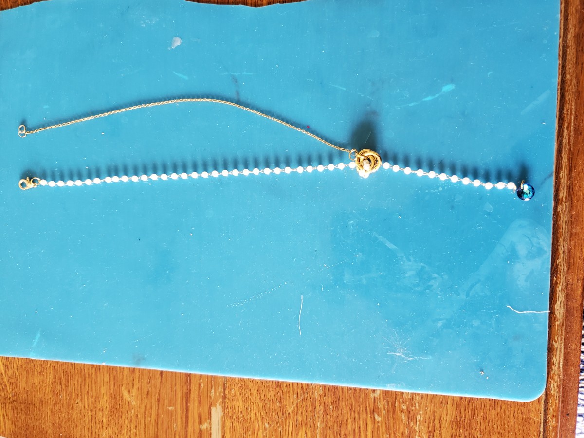 Ajoutez ensuite la chaîne nacrée. Pour cela, passez votre chaîne à l'intérieur de l'intercalaire, puis repassez l'une des extremités dans l'intercalaire pour avoir cet efffet d'enroulement autour de l'intercalaire.
