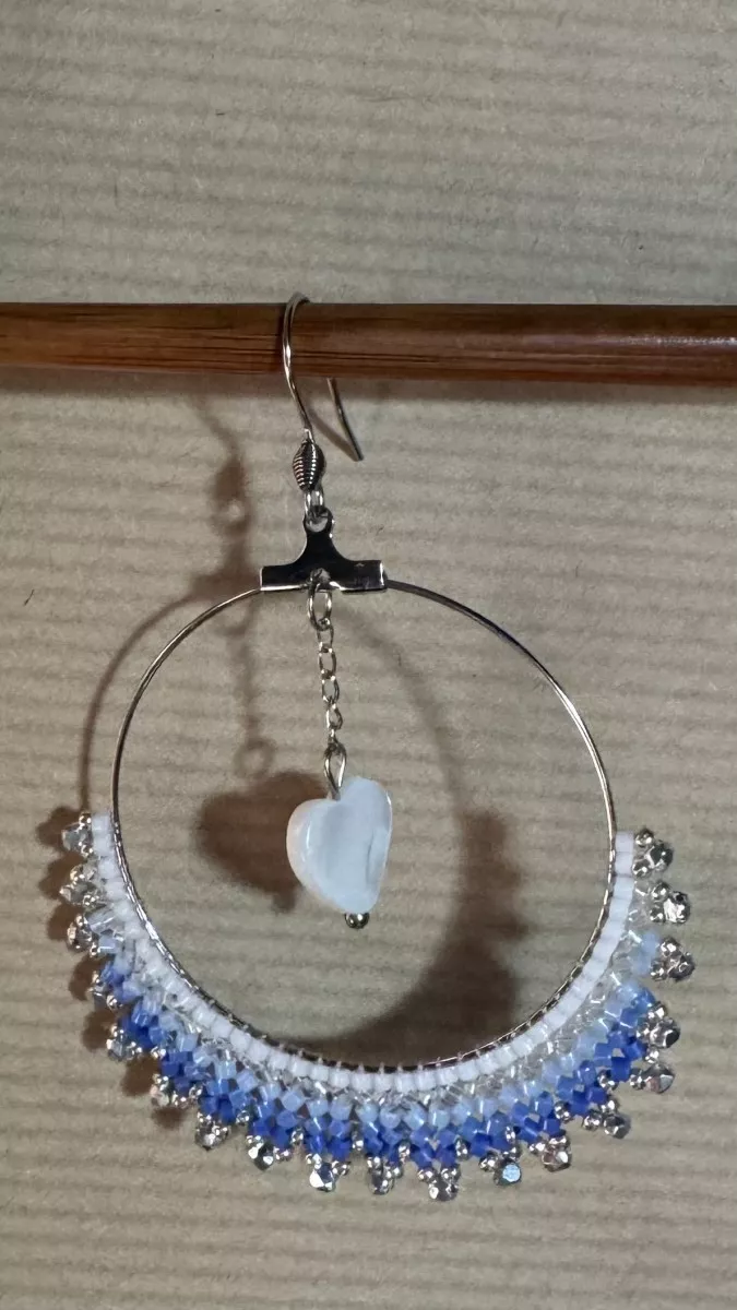 Redressez le bout du fil métallique de la créole, au dos, avec une pince plate pour éviter que la créole ne s'ouvre pendant le tissage. Coupez environ 1,5 m de fil fireline 0,10 mm et enfilez-le sur une aiguille taille 12. Faites un double noeud sur votre créole à l'endroit où vous souhaitez commencer votre tissage. Gardez 20 cm de bout de fil. Pour faire votre premier rang en brick stitch, enfilez deux perles DB-0352 puis faites passer l'aiguille sous la créole pour la faire ressortir par le centre. Repassez ensuite l'aiguille dans la deuxième perle enfilée. Serrez bien afin de placer les perles perpendiculairement à la créole. Passez à nouveau dans la première perle, puis dans la deuxième et serrez pour redresser les deux perles.