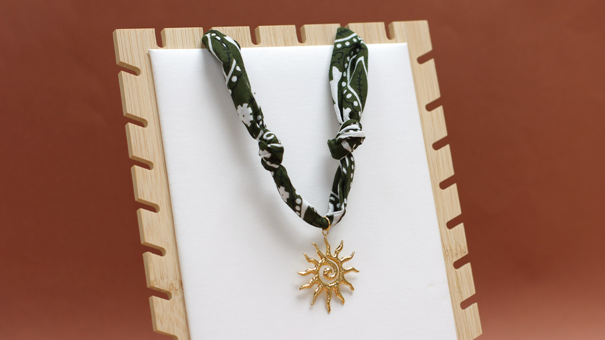 Enfin, pour la dernière version, coupez une large bande de bandana d'environ 8 cm, pliez-la à la manière d’un biais, et attachez-la à une grosse chaîne pour composer un sautoir sans fermoir. Un pendentif soleil placé au centre vient ajouter un côté chic au Bandana et complète le côté vintage du collier. La chaîne est un reste du tuto bracelet maillons grain de café que vous avez adorés ! Si vous avez déjà commandé le matériel du bracelet grain de café ou si les deux tutos vous tentent, n'hésitez pas à combiner le matériel !