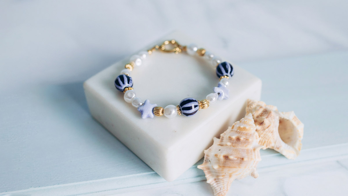 Ce bracelet en perles est une excellente idée de bijou à créer pour l’été. Facile à réaliser en seulement 15 minutes, il combine des perles en céramique bleues et blanches avec des étoiles de mer et des perles imitation perles d’eau douce, créant un look frais et léger, parfait pour la saison. Les étoiles de mer sont vraiment à la mode cet été donc n'hésitez pas à les ajouter à vos créations estivales ! C'est le motif marin que vous verrez partout ! La tendance est aussi à l'enfilage de perles de façon aléatoire, ce qui permet de créer un style plus naturel. C'est ce que j'ai fait pour ce bracelet, tout en respectant une certaine logique : j'ai mis des petites perles près du fermoir, plutôt que des grosses, pour pouvoir l'attacher plus facilement. J'ai aussi bien réparti les touches de doré.