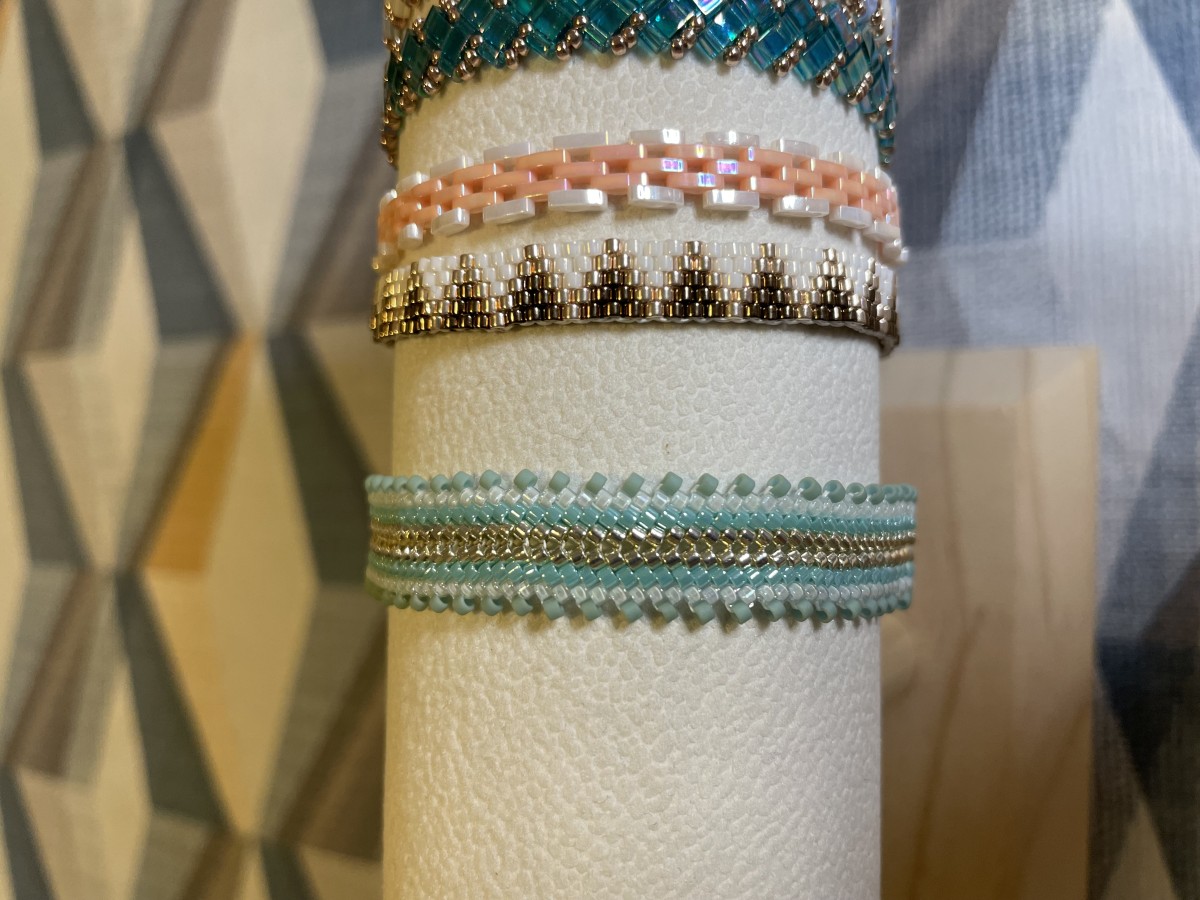 Nous avons réalisé ce bracelet épi aux couleurs douces et givrées dans un camaïeu de bleu mêlé à des apprêts en argent 925, comme un joli flocon à votre poignet. Vous pouvez bien entendu varier les couleurs de saison et opter pour une palette plus chaleureuse dans les tons bruns/terracotta ou violine/bordeaux avec des apprêts avec finition dorés par exemple. Nous avons un large choix de Miyuki Delica 11/0 sur le site.