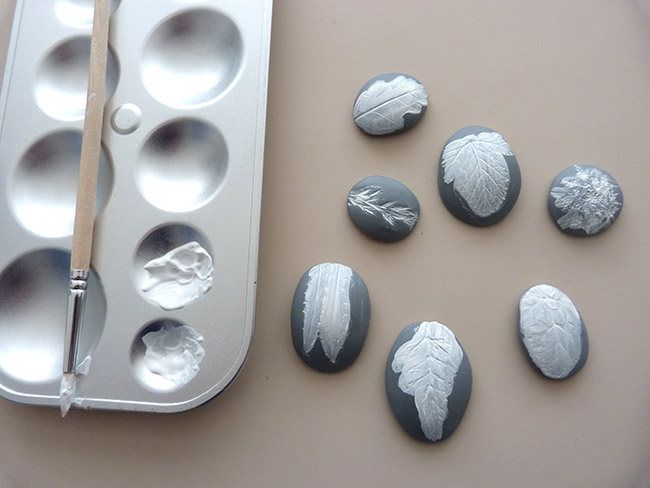 Ajoutez de la peinture acrylique blanche dans les creux des empreintes. Faîtes une cuisson à 120 degrés pendant 30 minutes.