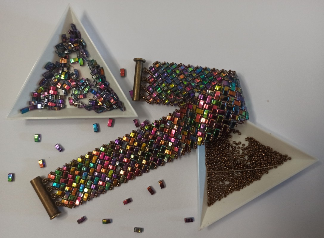 Les perles ont des reflets très changeants selon l'éclairage. Au fil du tissage des perles, j'ai toujours mis la face la plus brillante du même côté. Le résultat est top?!